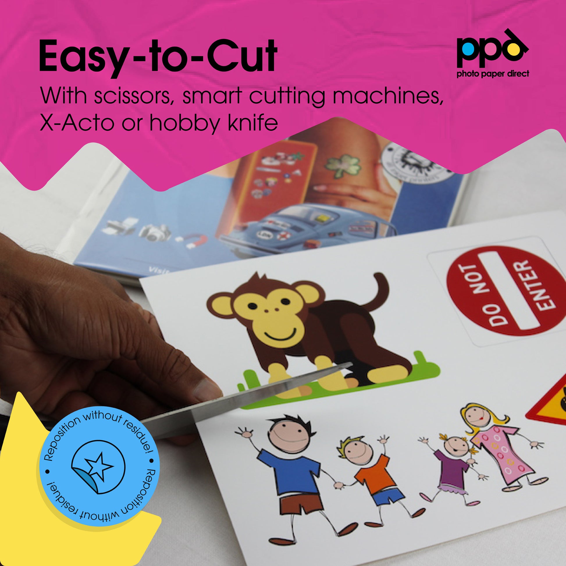 Print your favorite artwork, photos, drawing, or a company logo with Photo Paper Direct (PPD) Vinyl Self-Adhesive Stickers. These matt stickers won't smudge or smear and print easily with any inkjet printer. Since they are low tack, you can reposition stickers when applying them. The adhesive shouldn't leave a sticky residue, you want to remove a sticker later (Great for decorating school locker doors and white boards for homework chores or other lists and organizational tools). Print photos, artwork, logos, and custom messages.