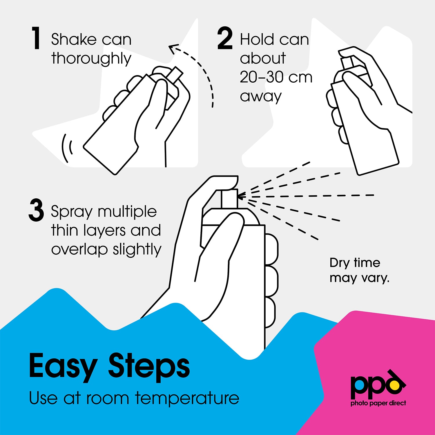 - Apply: Hold can about 20-30cm away
